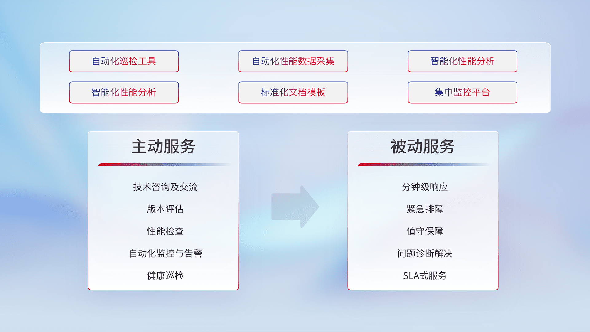智能化工具和标准化文档,,保障服务质量,,,,提供主动服务(包含技术咨询、、、、版本评估、、、、性能检查、、、、自动化监控与告警、、健康巡检)和被动服务包含(分钟级响应、、紧急排障、、值守保障、、问题诊断解决、、、、SLA服务)。。。