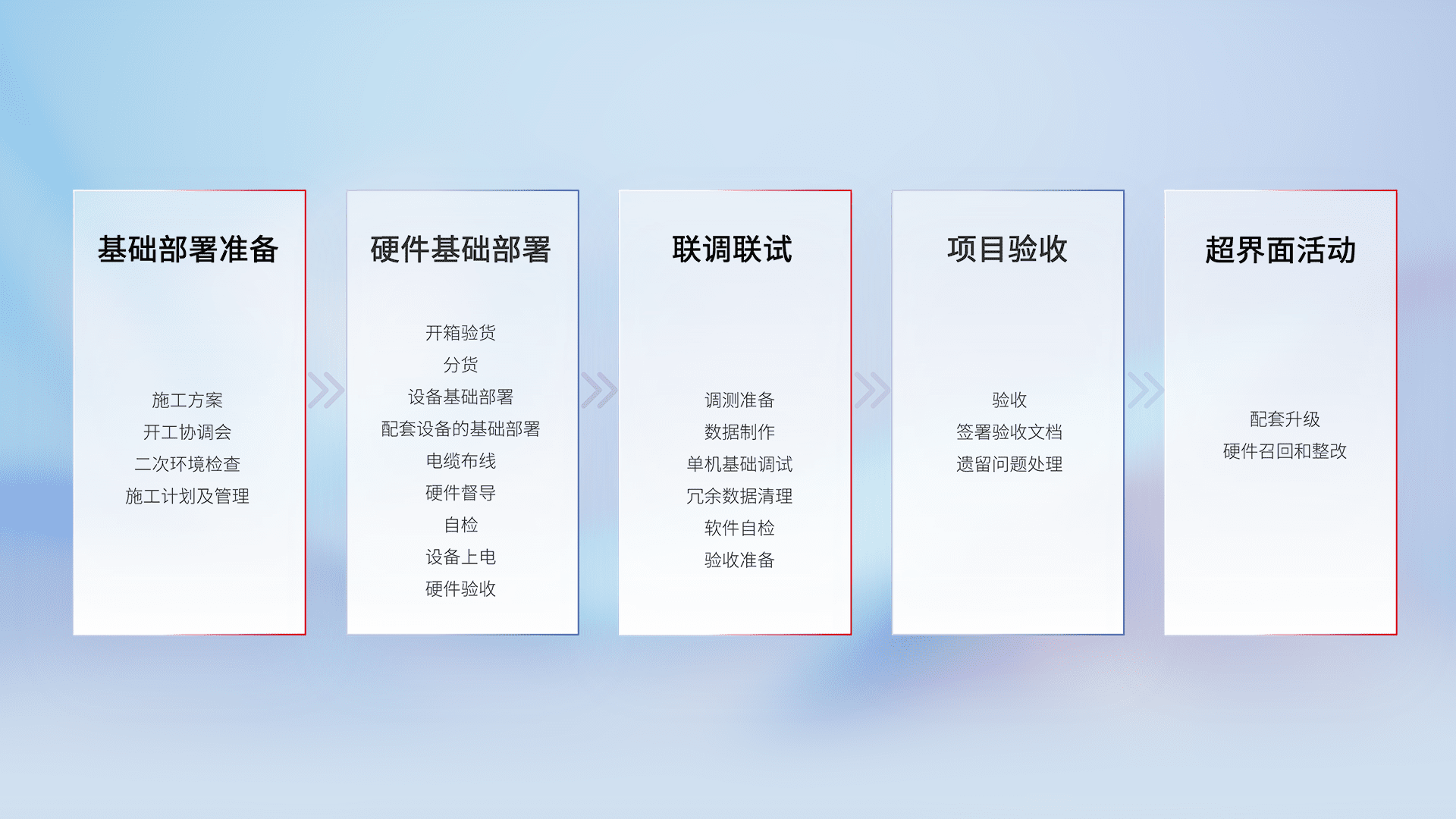 从基础部署准备、、、硬件基础部署、、联调联试、、项目验收、、越界面活动的全过程可追溯,,,,保证施工质量和进度。。。。